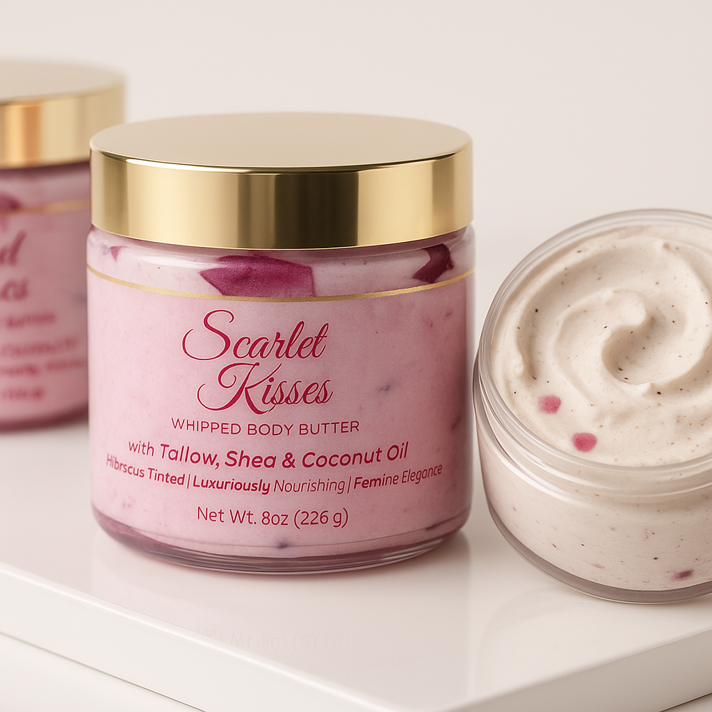 Indulge in the luxurious touch of Scarlet Kisses, a whipped body butter crafted with skin-loving tallow, shea butter, and coconut oil. Lightly tinted with hibiscus and drizzled with a hint of pink shimmer, this decadent blend melts into your skin, leaving it deeply nourished, radiant, and silky soft.